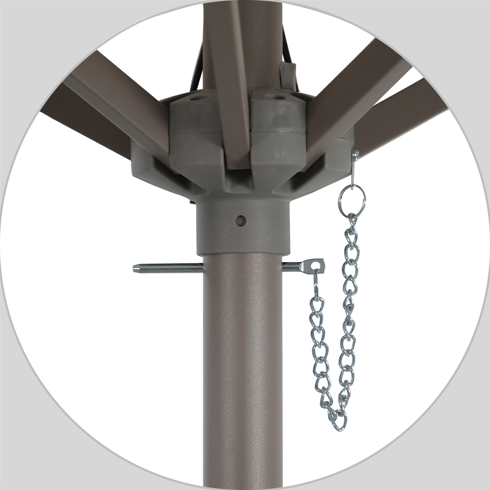 Locking Pin DesignThe umbrella has two holes to insert locking pin. Locking pin is for better stability and better protect our customers. |