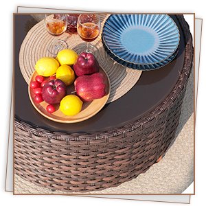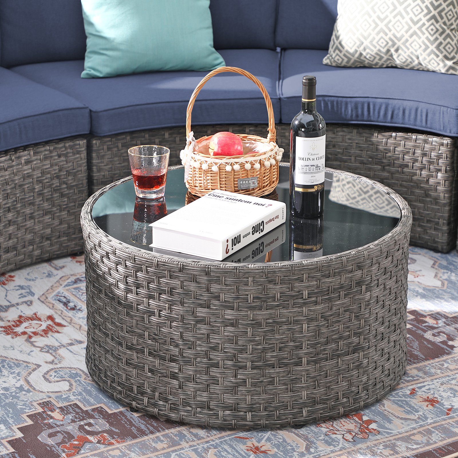 - ćFour Side Tablesć – The sophisticated wicker design side table is hand woven by resin wicker and powder coated steel framed for seasonal outdoor use. It is a great addition to the curved outdoor sectional to keep books, drinks, foods and small plates within reach. The tempered glass table top requires low maintenance.
