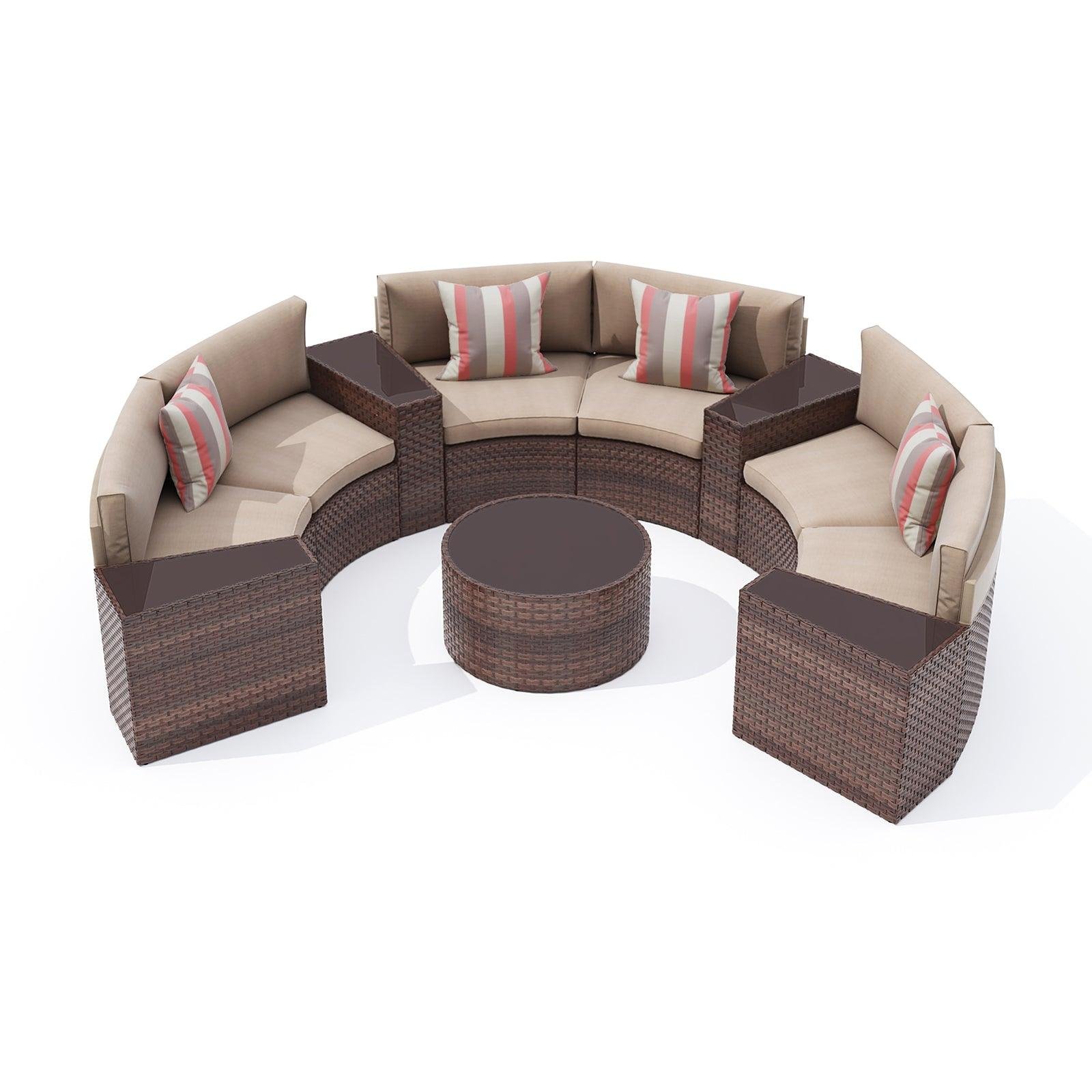 - ćHalf Moon Designć – Olefin fabric in beige with rich rattan weave creates stylish outdoor patio sectional set. Included 6 curved outdoor sofas that together create a unique semicircular lounge. The striped pillows add a touch of elegance and style to your garden, backyard, porch, sunroom or pool.