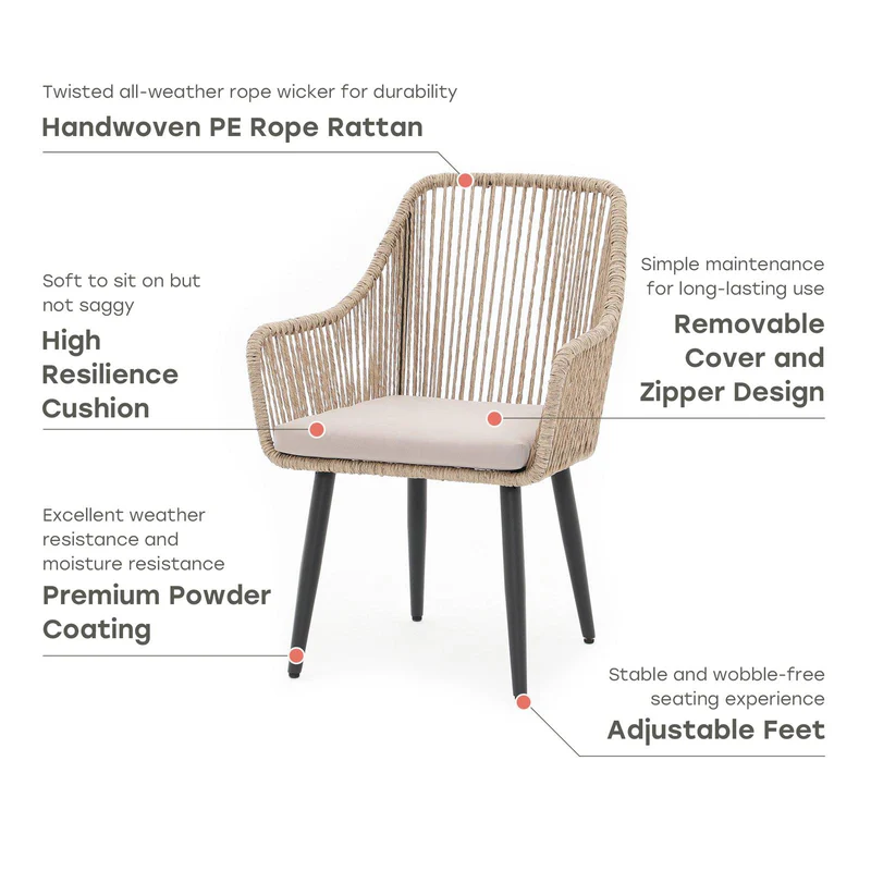- [Unique & Durable]: Featuring a solid powder-coated frame, the patio dining chair charms tapered legs and wows with adjustable feet that are a natural complement. The twisted all-weather rope wicker is genuinely innovative and provides durability and easy care.